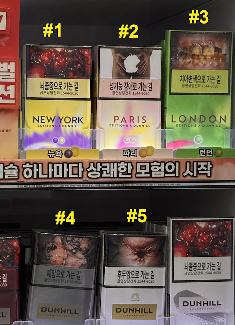 And I'd had no idea! It's been over five years now since I moved back to Korea, but since I quit smoking many years ago (except for the very very occasional puff on my favorite pipes, for memory's sake) I never paid much attention to the packets of cigarettes behind the counter at every convenience store. Sure, I sometimes see discarded packs with gross photos of a ruined lung or some such prominently displayed, but never thought much of it. After all, smoking is already pretty severely frowned upon as an evil habit here in Korea -- I just never realized how severely! Today, for the very first time I happened to actually pay attention to the scary warnings on cigarette packs, and I just couldn't help but laugh.